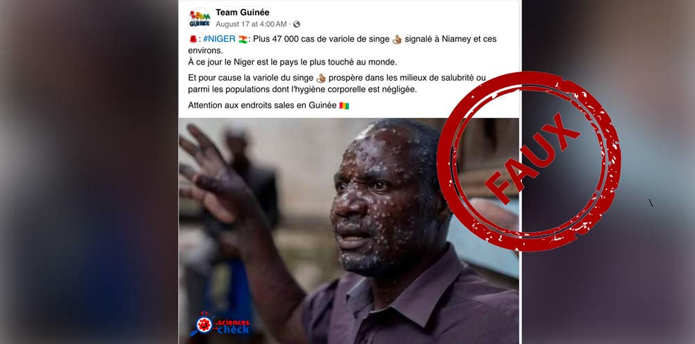 La publication, faite le 17 août 2024, lit : « Niger: Plus 47 000 cas de variole de singes signalés à Niamey et ses environs. À ce jour, le Niger est le pays le plus touché au monde. Et pour cause la variole du singe prospère dans les milieux de salubrité ou parmi les populations dont l’hygiène corporelle est négligée. Attention aux endroits sales en Guinée ». La même affirmation a été partagée ici et ici.