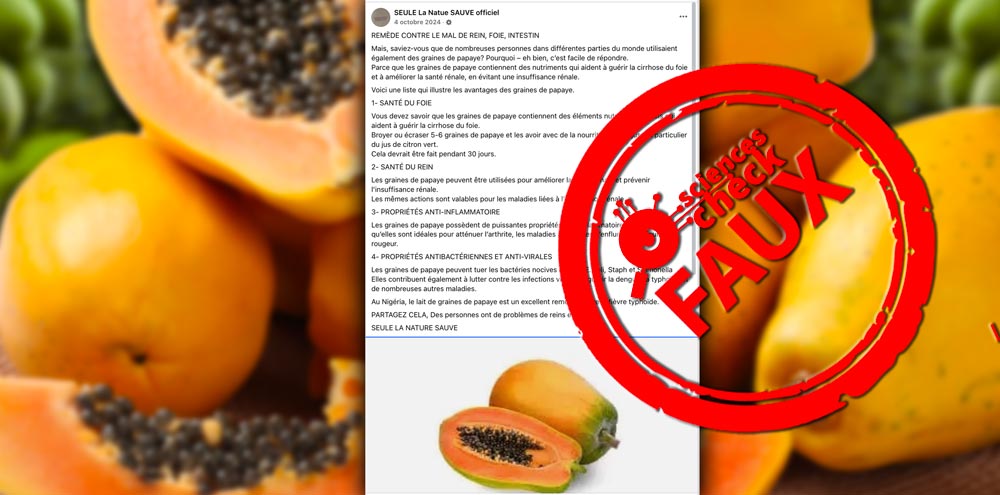 Une publication Facebook affirmant que la consommation des grains de papaye permet de guérir les maux de rein et du foie. Le post est accompagné d’une liste énumérant divers bienfaits supposés, notamment des propriétés anti-inflammatoires, antibactériennes et antivirales.